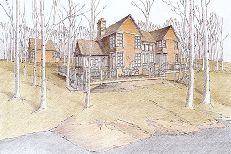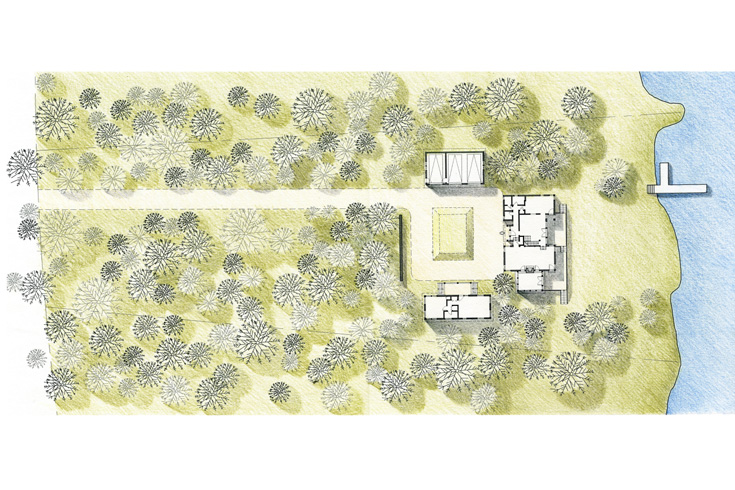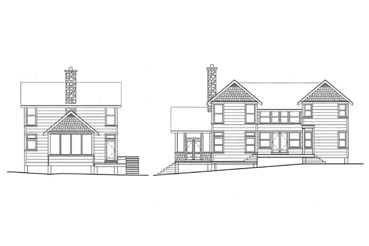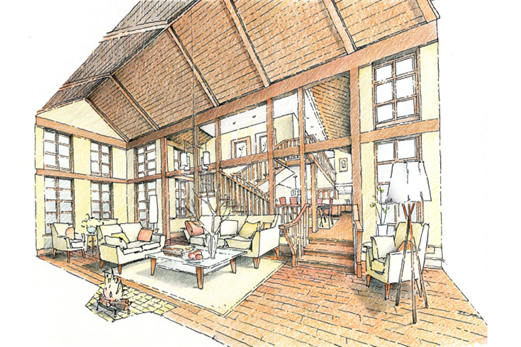 The design for this cottage focuses on the dramatic double-height main space, where a substantial stone fireplace acts as its central focus. The post-and-beam heavy timber construction in the central space gives the home a feeling of solidity, balanced by the light framing of the screened Muskoka room.