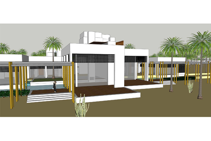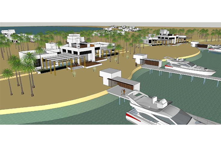 Four artificial islands are master planned to accommodate 100 luxury villas. The villas are designed in a variety of layouts from 4-bedroom luxury suites to semi-detached single bedroom units, each with their own private beach and boat mooring. The harsh climatic conditions of the desert are mitigated with the deep overhangs protecting the homes’ window areas. Howard Rideout is the chief designer of this project as a consultant to B+H Architects, Shanghai.