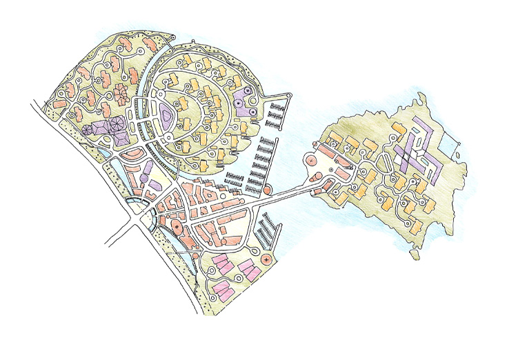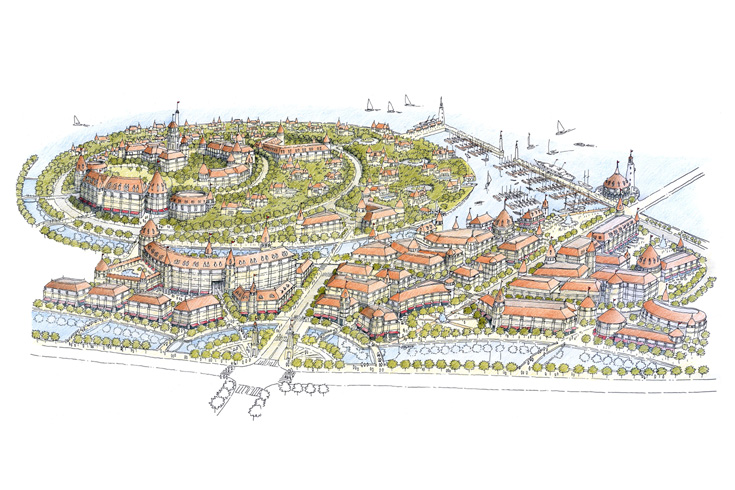 A dense commercial shopping and restaurant village inspired by Qingdao’s historic architectural heritage is the gateway into the site. Axial views are provided from this compact pedestrian shopping area to the two outer islands, one natural and the other man-made, ensuring that visitors are attracted deep into the site to explore its many waterfront attractions. This project was designed for B+H Architects.
