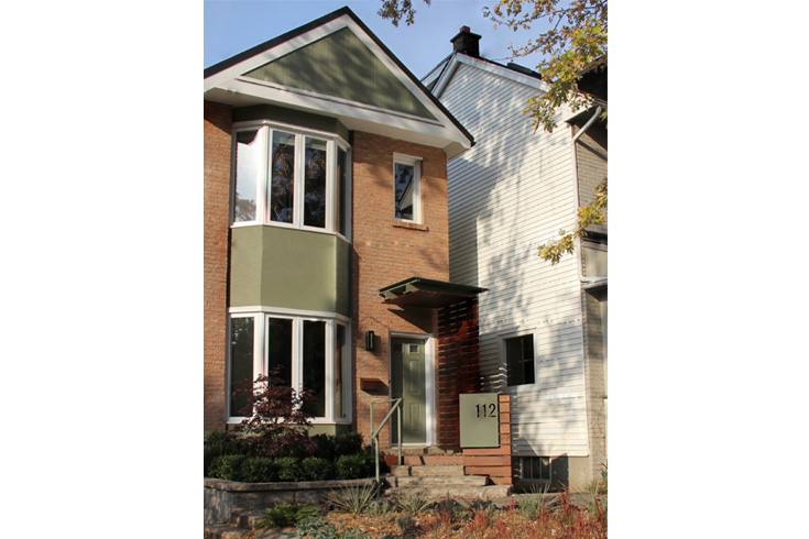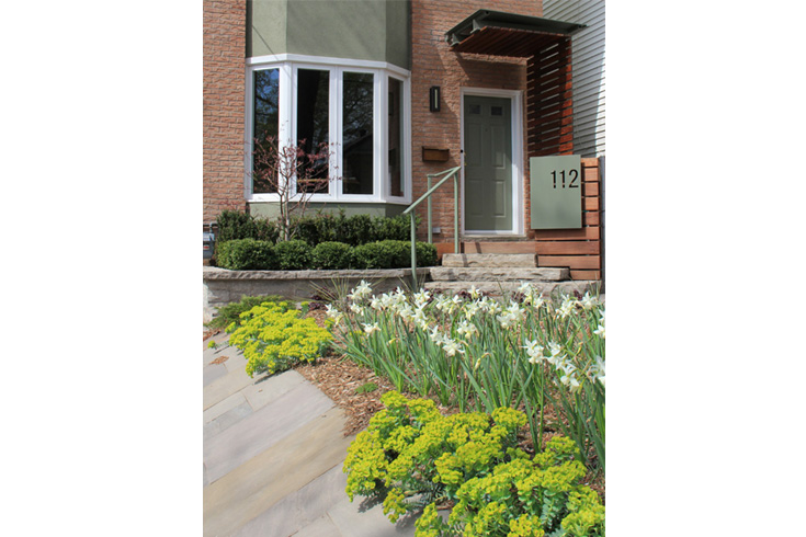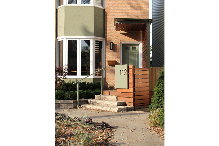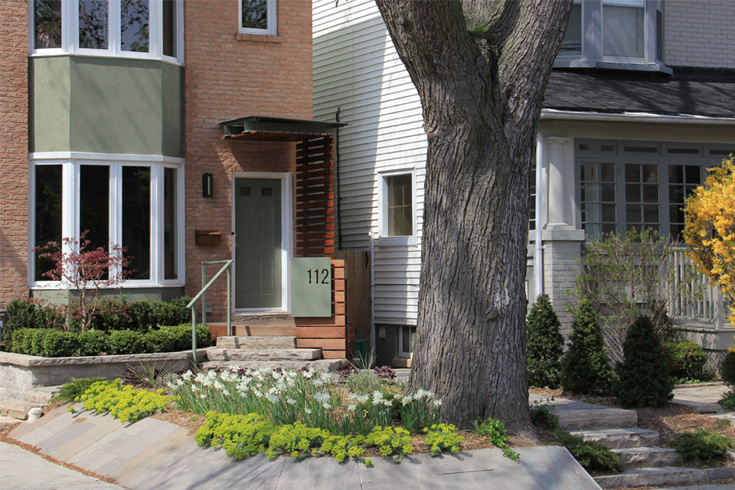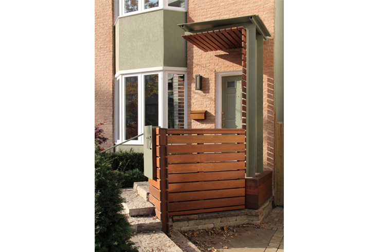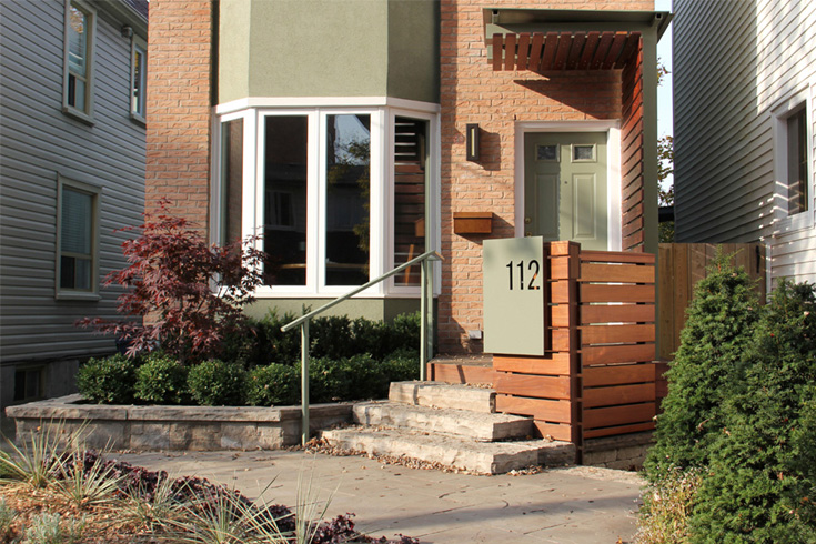 The canopy and porch landscaping to this Riverdale residence remedies many concerns this homeowner had with their existing front entry. The new design shields the view of an adjacent property and hides the recycling and garbage bins. This feature also provides a protective canopy above the main entry with a modern design that welcomes guests, as they arrive to the home.